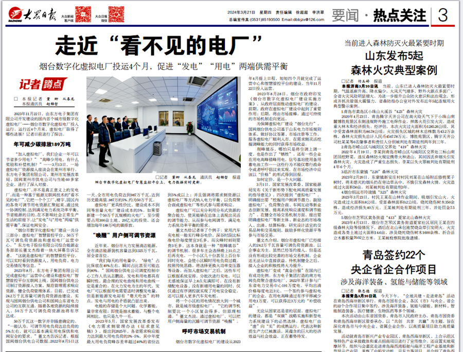 2023年11月22日,由佛山市聚可创科技有限公司开发建设的国内首个城市级数字化虚拟电厂——烟台市数字化虚拟电厂投入运行。运行近4个月来,虚拟电厂取得了哪些进展?记者日前进行了探访。